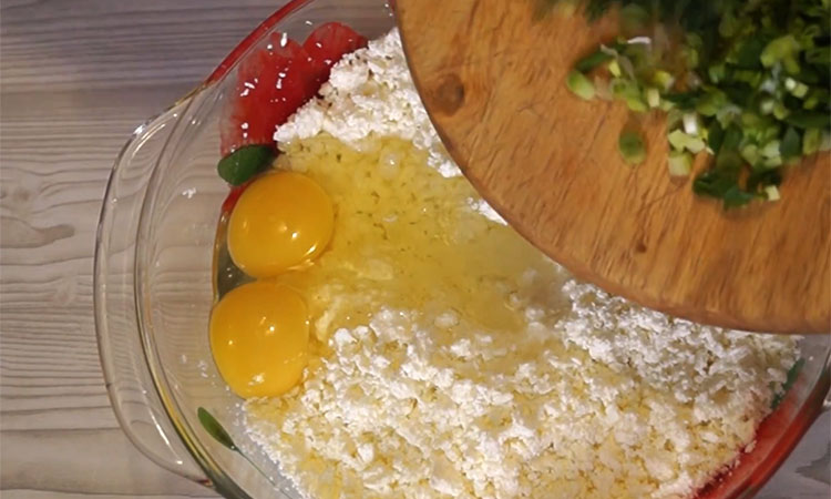 Сформируйте из него жгут, разделите на семь равных частей (примерно по 150 г каждая), скатайте в шарики и уберите в холодильник минимум на один час, обернув пищевой пленкой. Подготовьте начинку: смешайте творог с двумя яйцами, солью и мелко порубленной зеленью лука и укропа до однородного состояния. Достаньте кусочек теста из холодильника и раскатайте его в очень тонкий круг диаметром около 35 см, чтобы он буквально просвечивал.