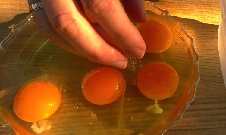 Выложите нарезанные овощи и зелень в медовую смесь, чтобы маринад напитался их соком и ароматом. Теперь крайне осторожно разбейте каждое яйцо и отделите желтки от белков руками или с помощью скорлупы, стараясь не повредить нежную оболочку.