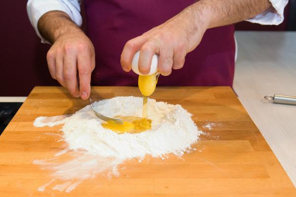 Замесить тесто: разбить яйца и перемешать с мукой до образования однородной массы. Тесто закрыть пленкой и поставить в холодильник на 30 минут. Разделить тесто на три равные части и раскатать скалкой или на машинке для домашней пасты до толщины 1.5 мм. Подсушить листы с обеих сторон.