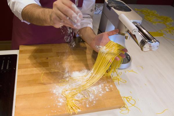 Получившиеся листы теста осторожно накрутить на скалку, предварительно посыпав мукой. Снять рулон теста со скалки и нарезать длинные тонкие полоски. Использовать насадку для спагетти на машинке для домашней пасты. Подсушить спагетти в небольшом количестве муки.