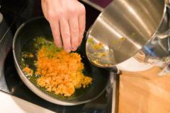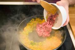 Когда испарится овощной сок, можем добавить фарш. Тщательно перемешать ингредиенты и обжарить.