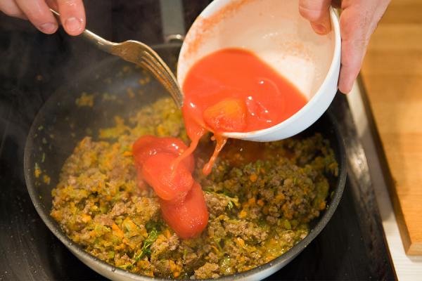 Добавить очищенные помидоры в собственном соку, предварительно размельчив их вилкой.