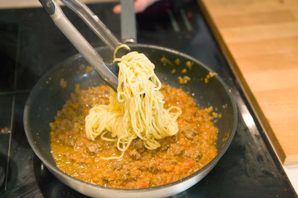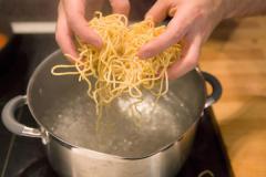 В кипящей соленой воде отварить домашние спагетти в течение 3 минут до состояния аль денте, что в переводе с итальянского означает «на зубок». Покупные спагетти варить, как указано на упаковке.