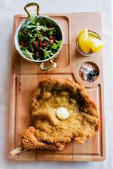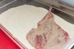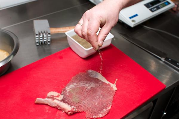 После муки отбитую корейку кладем в льезон и в панировачные сухари.