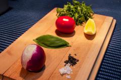 Помидор очищаем от семян и нарезаем кубиком, лук и базилик так же.