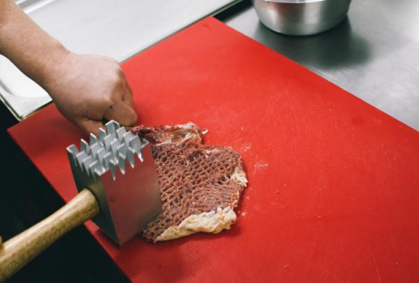 Корейку телячью равномерно отбиваем молотком по всей поверхности.