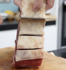 При нагревании жир с пленкой сжимаются, деформируя мясо. Чтобы этого не произошло, сбоку, на полоске жира необходимо сделать глубокие надрезы.