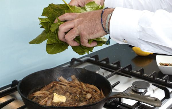 В сковороду, где готовилось мясо, выкладываем шпинат, масло, каперсы, анчоусы, оставшийся лук-шалот, все перемешиваем и обжариваем, пока листья шпината не начнут вянуть. Это будет гарнир. Анчоусы придадут блюду необходимую соленость, а каперсы повысят кислотность, которая необходима для эффективного переваривания мяса. Перед подачей на шпинат выжимаем лимонный сок.