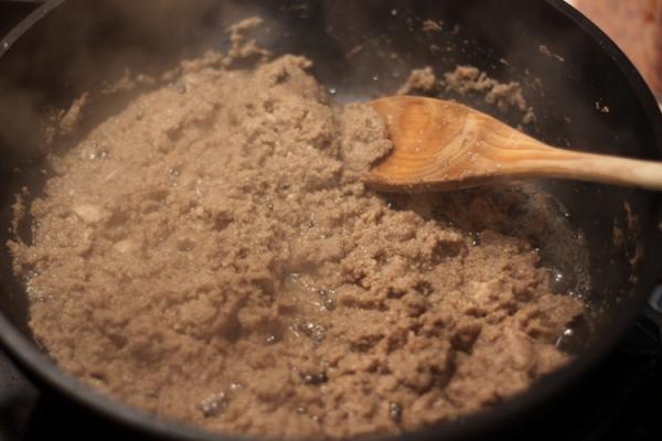 Грибы высыпаем в кухонный комбайн и размалываем в пюре. Получившуюся массу выкладываем на раскаленную сковороду и выпариваем из грибов воду, обжаривая на сильном огне в течение примерно 10 минут, постоянно помешивая. Грибы перекладывем на тарелку и оставляем охлаждаться.