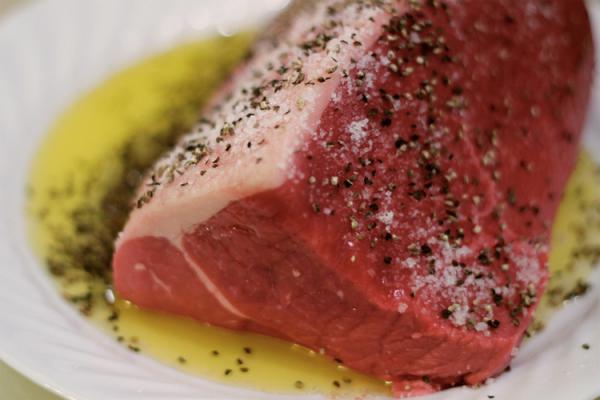 Разогреваем немного оливкового масла. Говядину приправляем солью и перцем и обжариваем по 30 секунд с каждой стороны. Снимаем мясо с огня, даем немного остыть и обмазываем горчицей.