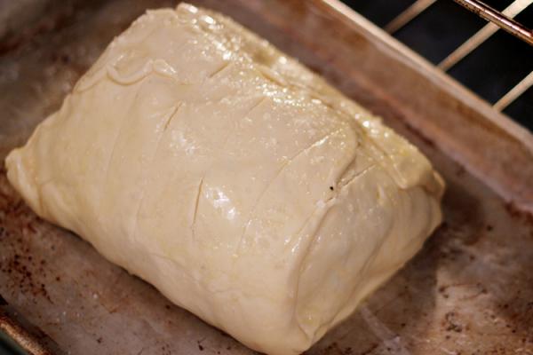 Разогреваем духовку до 200 °С. Достаем рулет из холодильника, делаем на нем небольшие надрезы и смазываем их желтком. Запекаем рулет в течение 20 минут, затем убавляем температуру до 180 °С и продолжаем запекать еще 15 минут. Достаем мясо из духовки и даем ему отдохнуть 10-15 минут. После этого говядину «Веллингтон» можно нарезать и подавать.