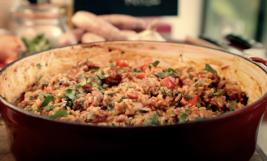 Разогреть духовку до 190 градусов. Говядину щедро приправить солью и перцем. Растопить масло в большой голландской жаровне на среднем огне. Выложить говядину и обжарить до коричневого цвета (в случае необходимости работать партиями) со всех сторон. Обжаренное мясо переложить на тарелку.