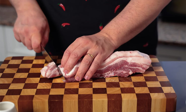 Выберите мясистую грудинку с хорошими прослойками жира и нарежьте её средними кусочками, как на шашлык. Помните, что слишком мелкие куски могут быстро пересохнуть, поэтому придерживайтесь среднего размера. Лук очистите и нарежьте достаточно крупно — сначала пополам, а затем на широкие четвертинки. Кинзу мелко порубите, но пока держите её на доске отдельно от лука и мяса. Выложите кусочки свинины на абсолютно холодную сковороду.