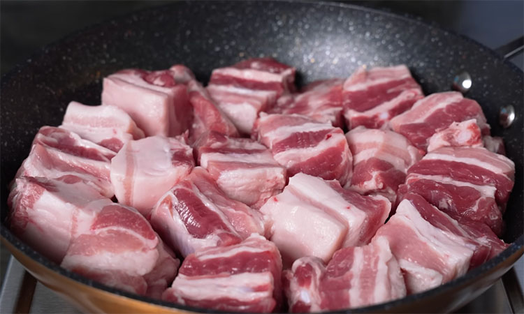 Это принципиальный момент рецепта: сковорода пока не должна быть включена. Так как свинина достаточно жирная, из неё начнет постепенно вытапливаться жир, и мясо будет жариться на собственном жире без добавления масла. Укладывайте кусочки не слишком плотно друг к другу. Если заполнить сковороду до отказа, мясо начнет выделять влагу и вариться, а нам нужно добиться именно эффекта жарки. Теперь включайте температуру на максимум и дожидайтесь момента, когда жир начнет активно вытапливаться. Когда мясо хорошо подрумянится со всех сторон на высокой температуре и выделит достаточно жира, отправьте в сковороду нарезанный лук.