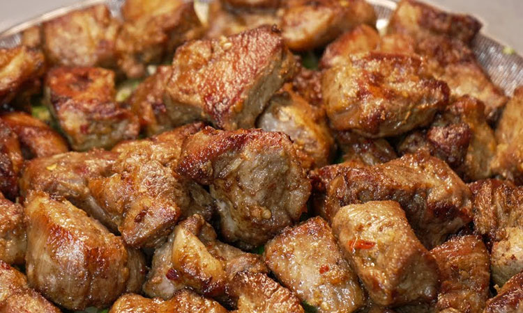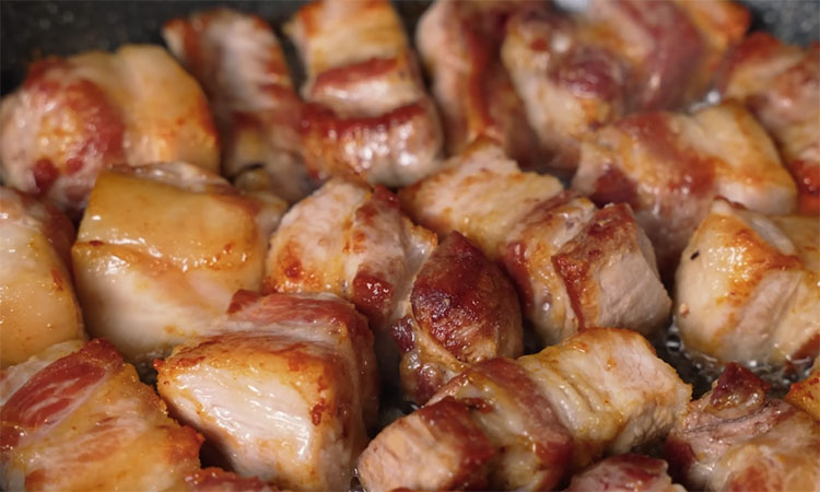 Настоящий кавказский колорит свиной грудинке по-грузински придает сочетание карамелизованного лука, острого перца и ароматной кинзы. Когда лук томится вместе с мясом на сильном огне, он пропитывается мясными соками и становится сладковатым, создавая идеальный фон для чесночной остроты. Финальный штрих в виде капли уксуса магическим образом балансирует жирность свинины, делая вкус более глубоким и выразительным — пожалуй, вкуснее рецепта свинины вы уже не найдете.