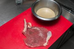 После муки отбитую корейку кладем в льезон и в панировачные сухари.