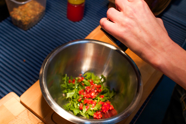Помидор очищаем от семян и нарезаем кубиком, лук и базилик так же.