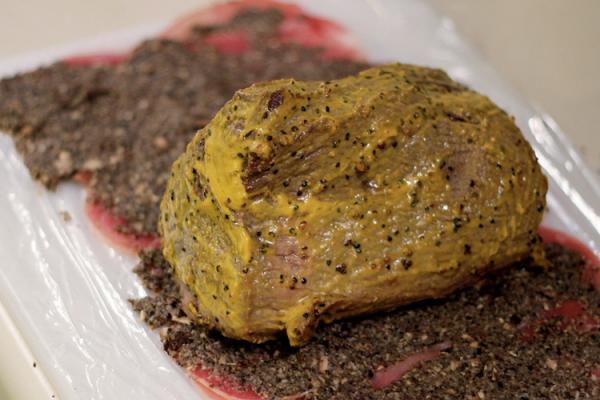 Разогреваем немного оливкового масла. Говядину приправляем солью и перцем и обжариваем по 30 секунд с каждой стороны. Снимаем мясо с огня, даем немного остыть и обмазываем горчицей.