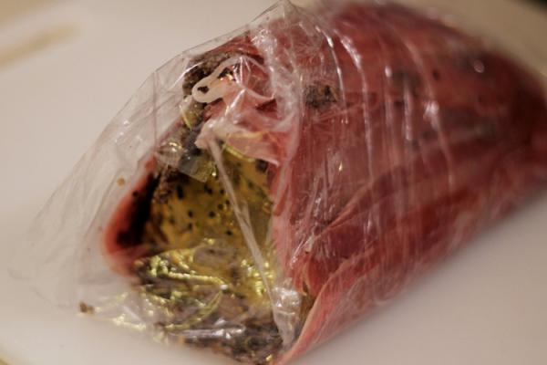 Оборачиваем ветчину вокруг говядины, заворачиваем рулет в пленку и убираем на 15-20 минут в холодильник.